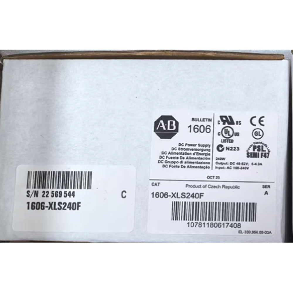 The Allen-Bradley 1606-XLS240F power supply module is a Bulletin 1606 power supply module with an output voltage range of 48 to 56 Volts DC and a nominal output voltage rating of 48 Volts DC. The efficiency rating of this power supply module is 91.2% at 120 Volts AC and 92% at 230 Volts AC. The 1606-XLS240F power supply module meets the CE, C-Tick, and UL standards, and several other industrial standards as well. This module is made to be mounted on a DIN Rail and it has spring-clamp terminals that support quick connections. The 1606-XLS240F power supply module has input current ratings of 2.22 Amps at 120 Volts AC and 1.22 Amps at 230 Volts AC.