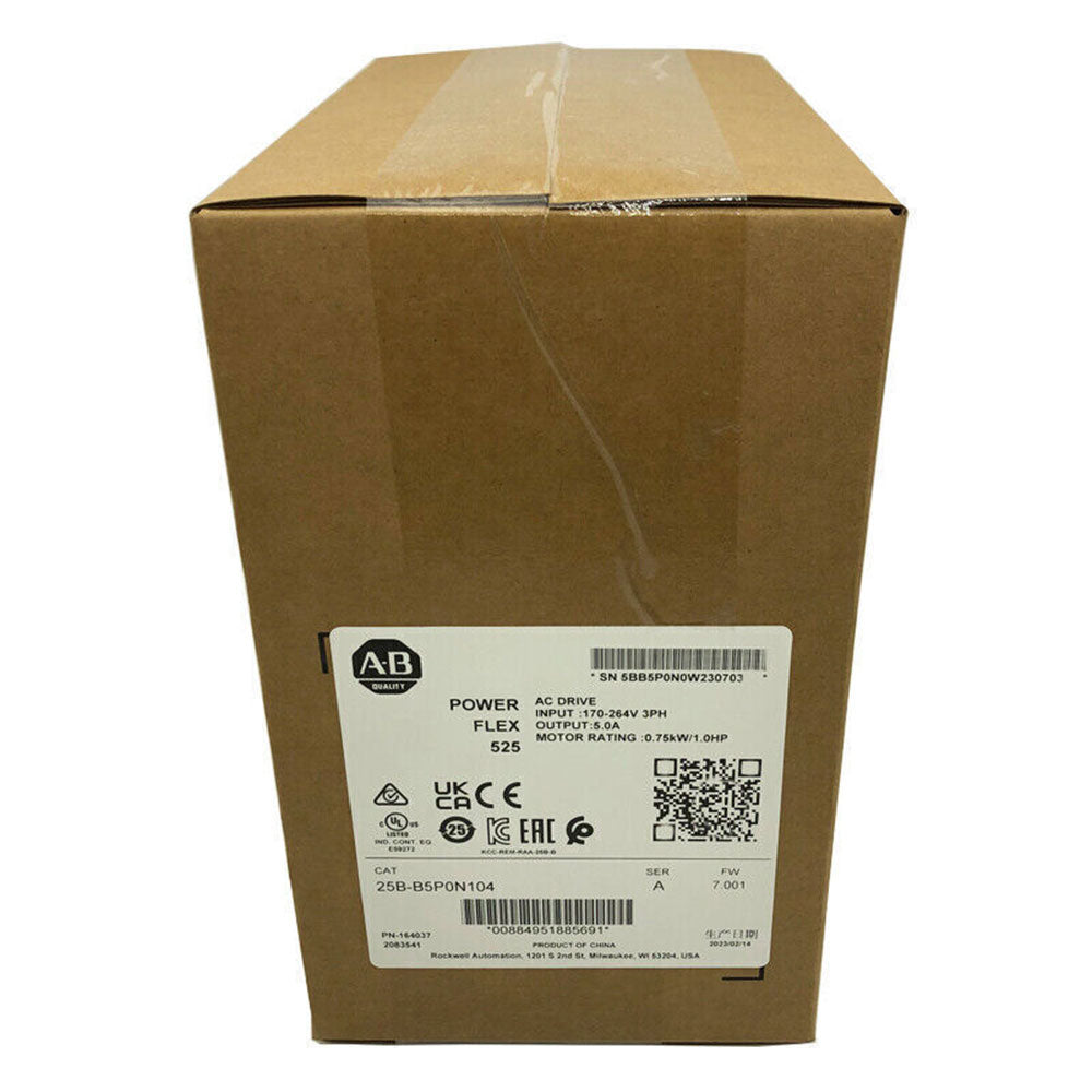 The Allen-Bradley 25B-B5P0N104 is a PowerFlex 525 Variable Frequency Drive (VFD). This VFD is powered with an input voltage range of 170-264VAC, 3-phase with applicable motor output 5.0 A and Power of 0.75 kW (1.0 HP) for normal duty and Heavy duty operation.