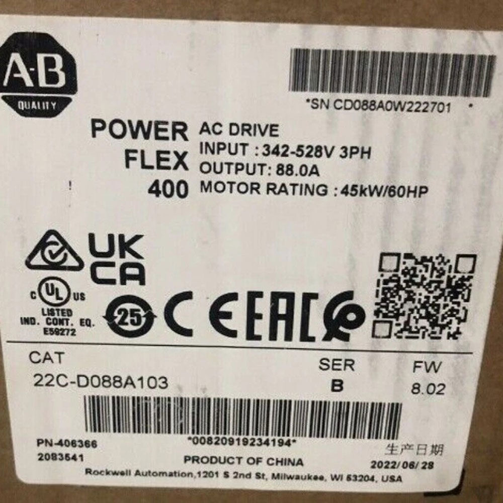 The Allen-Bradley 22C-D088A103 is a PowerFlex 400 Variable Frequency Drive (VFD). This VFD is specifically compatible for industrial fan and pump applications. It is powered with an input voltage range of 342-528VAC, 3-phase with applicable motor output of 88.0 A and Power of 45kW (60.0 HP).