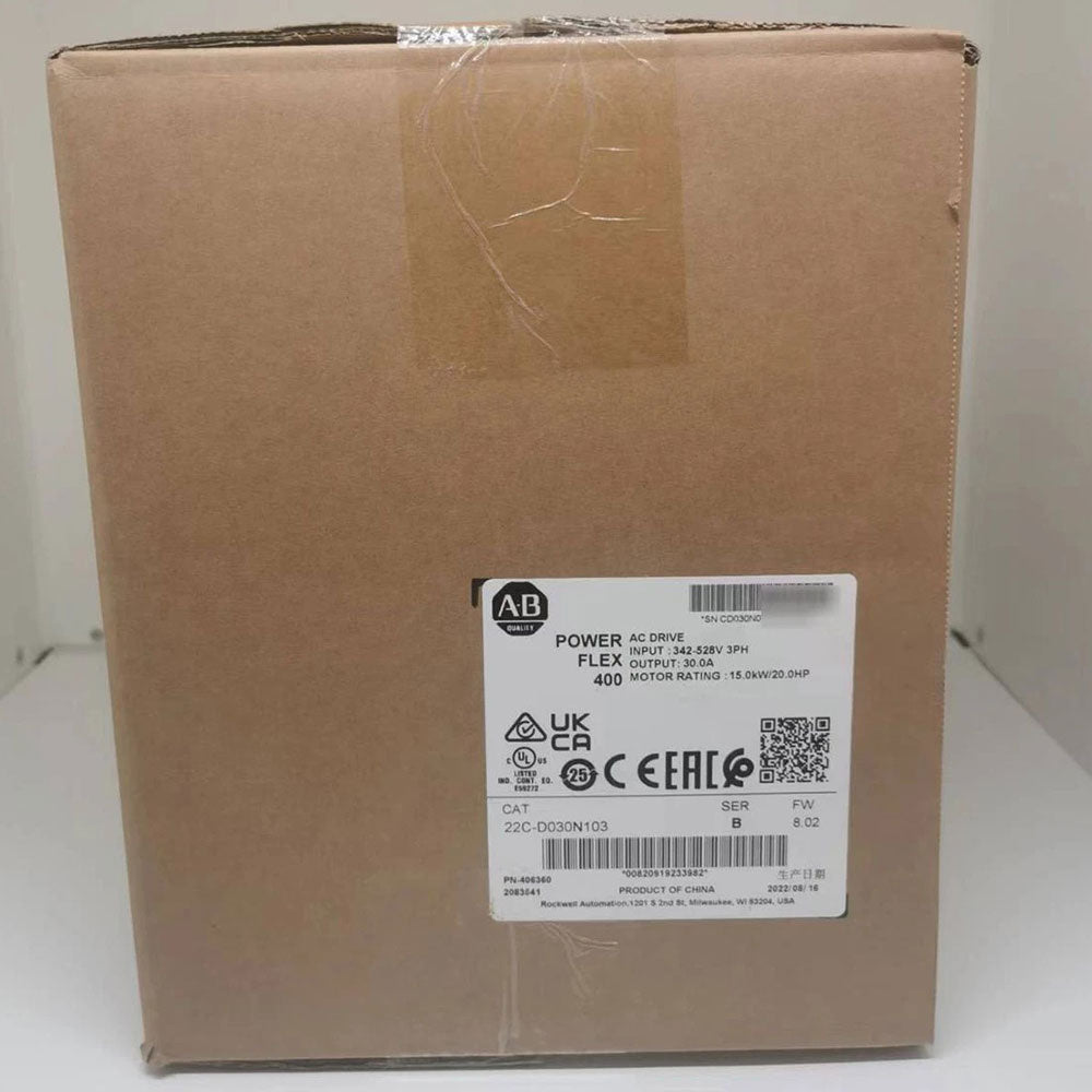 The Allen-Bradley 22C-D030N103 PowerFlex 400 adjustable frequency AC drive for Fan and Pump applications. This drive features an input voltage range of 380-480VAC, 3-phase and delivers output voltage of 0-460VAC, 3-Phase, with rated Current of 30.0 A @ 45 Deg. C and 27. 0 A @ 50 Deg. C and Power of 15.0 kW (20.0 HP). This drive is capable of sinusoidal Pulse Width Modulation (PWM) and Volts / Hertz control methods. It has an integral RS485 communication interface.