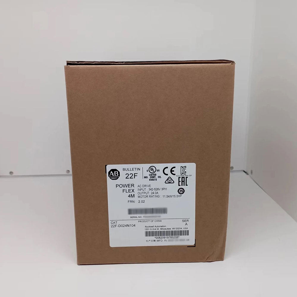 The Allen-Bradley 22F-D024N104 PowerFlex 4M adjustable frequency AC drive. This drive features an input voltage range of 380-480VAC, 3-phase and delivers output voltage of 0-460VAC, 3-Phase, with rated Current of 24.0 A and Power of 11.0 kW (15.0 HP). It has an integral RS485 communication interface.