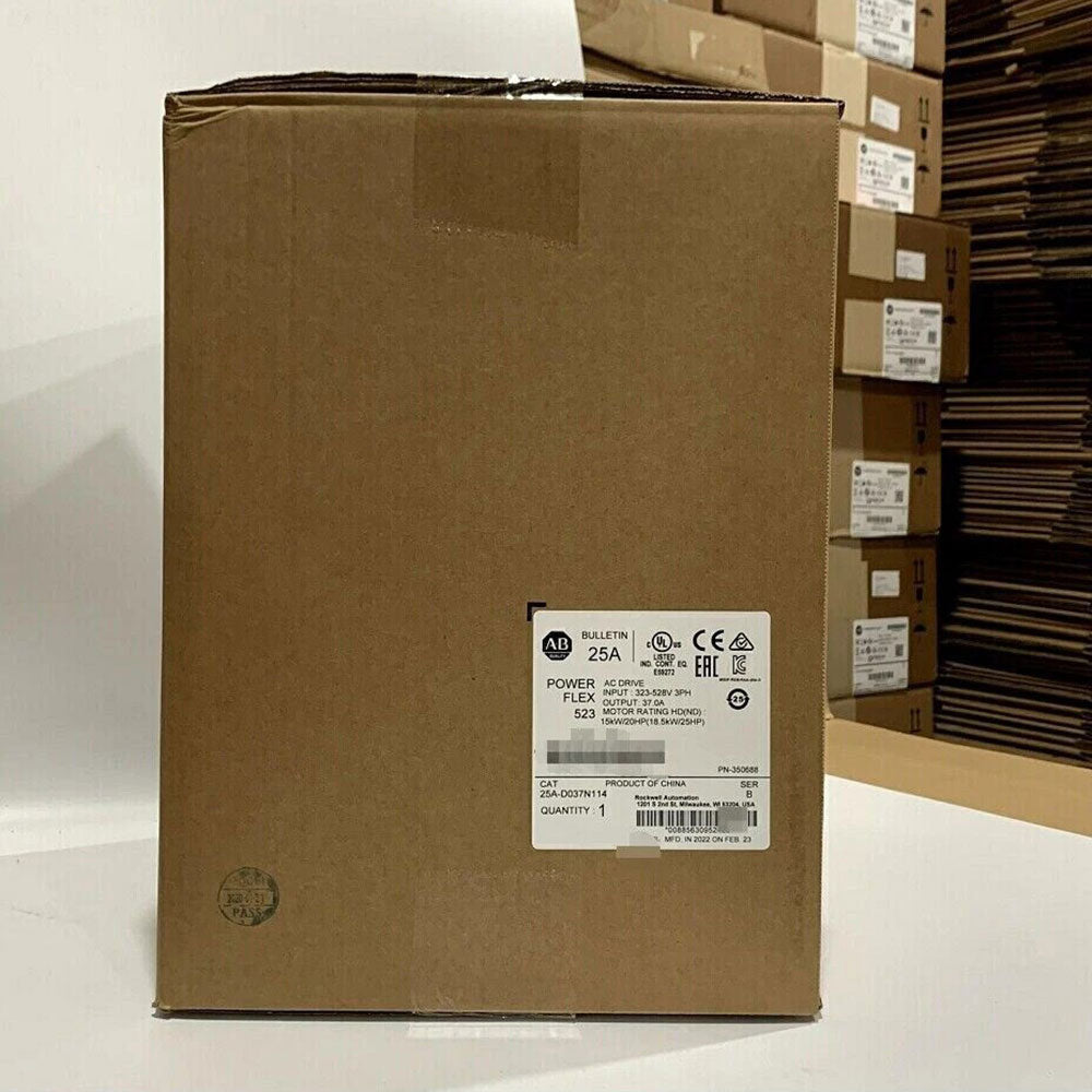 The Allen-Bradley 25A-D037N114 PowerFlex 523 adjustable frequency AC drive. This drive features an input voltage range of 380-480VAC, 3-phase and delivers output voltage of 0-460VAC, 3-Phase, with rated Current of 37.0 A and Power of 18.5 kW (25 HP) for normal operation and 20 kW (15 HP) for heavy duty operation. It has an integral RS485 communication interface. It is capable of Volts / Hertz and Sensorless Vector Control (SVC) method.